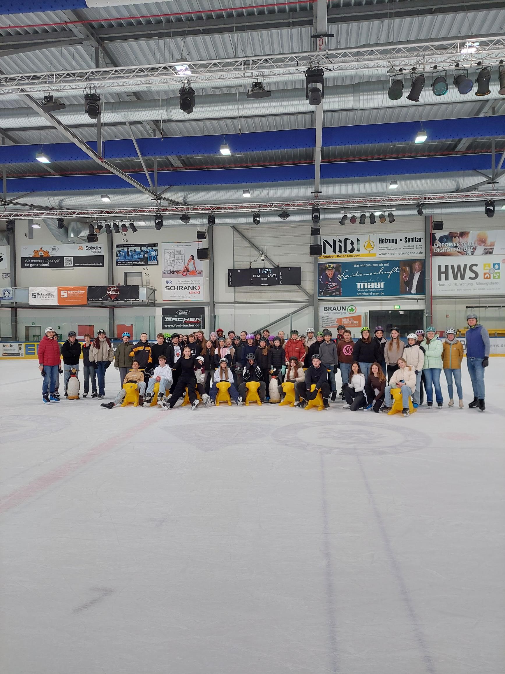 Die Wintersporttage der 7. Klassen, die am Dienstag und Mittwoch vor den Osterferien in der Saturnarena in Ingolstadt stattfanden, wurden für unsere Schülerinnen und Schüler zu einem echten Highlight. Schon die gemeinsame Zugfahrt sorgte für gute Stimmung und große Vorfreude. Nach einem kurzen Aufwärmspaziergang zur Arena hieß es dann: Schlittschuhe schnüren und ab aufs Eis!
