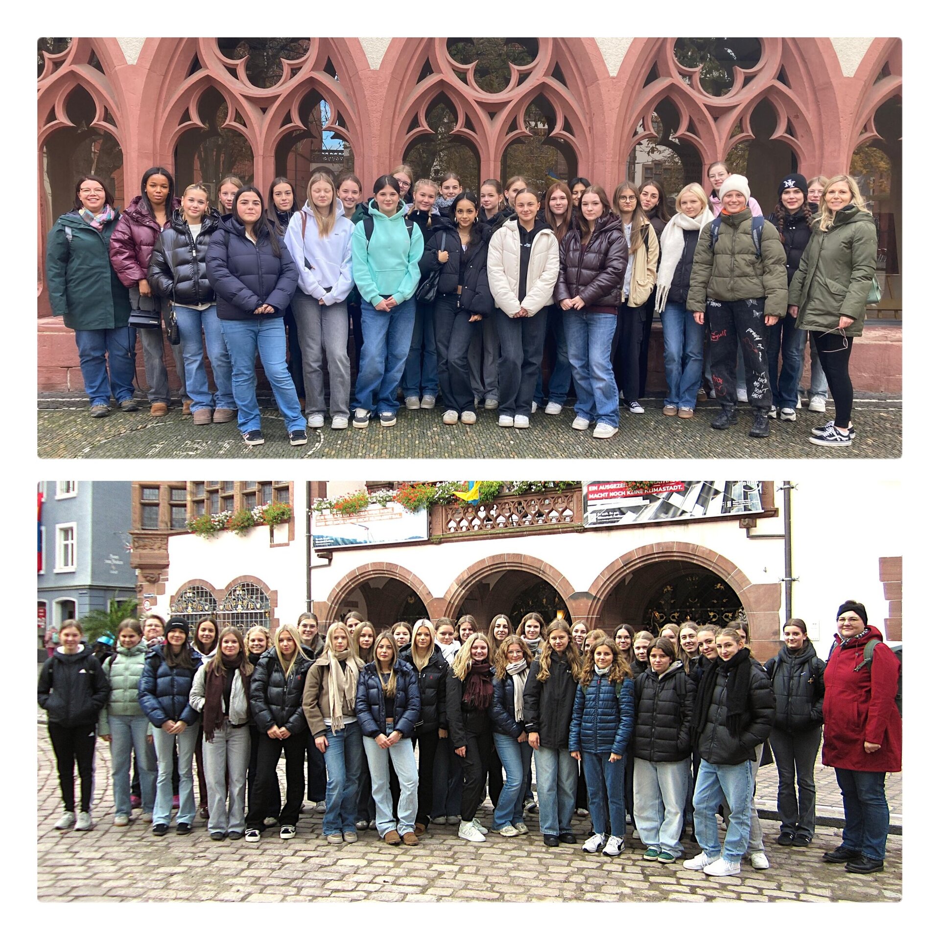 Nach langem Warten war es endlich so weit: Die Abschlussfahrt der Klassen 10 A und 10 B stand an. Am Montagmorgen startete die Reisergruppe bei starkem Regen. Auch bei der Ankunft in Freiburg im Breisgau am Nachmittag wollte der Regen noch nicht weichen. Trotzdem ließen sich die Schülerinnen und ihre Lehrerinnen Julia Simmel, Eva-Maria Medl, Eva Schwab und Sabine Grimm die Stimmung nicht verderben: Nach dem Beziehen der Zimmer in der Jugendherberge wurde das Gelände erkundet, ein kurzer Spaziergang in die Umgebung unternommen und der Abend klang bei einem gemeinsamen Essen und einer Runde Kicker oder Tischtennis gemütlich aus.
