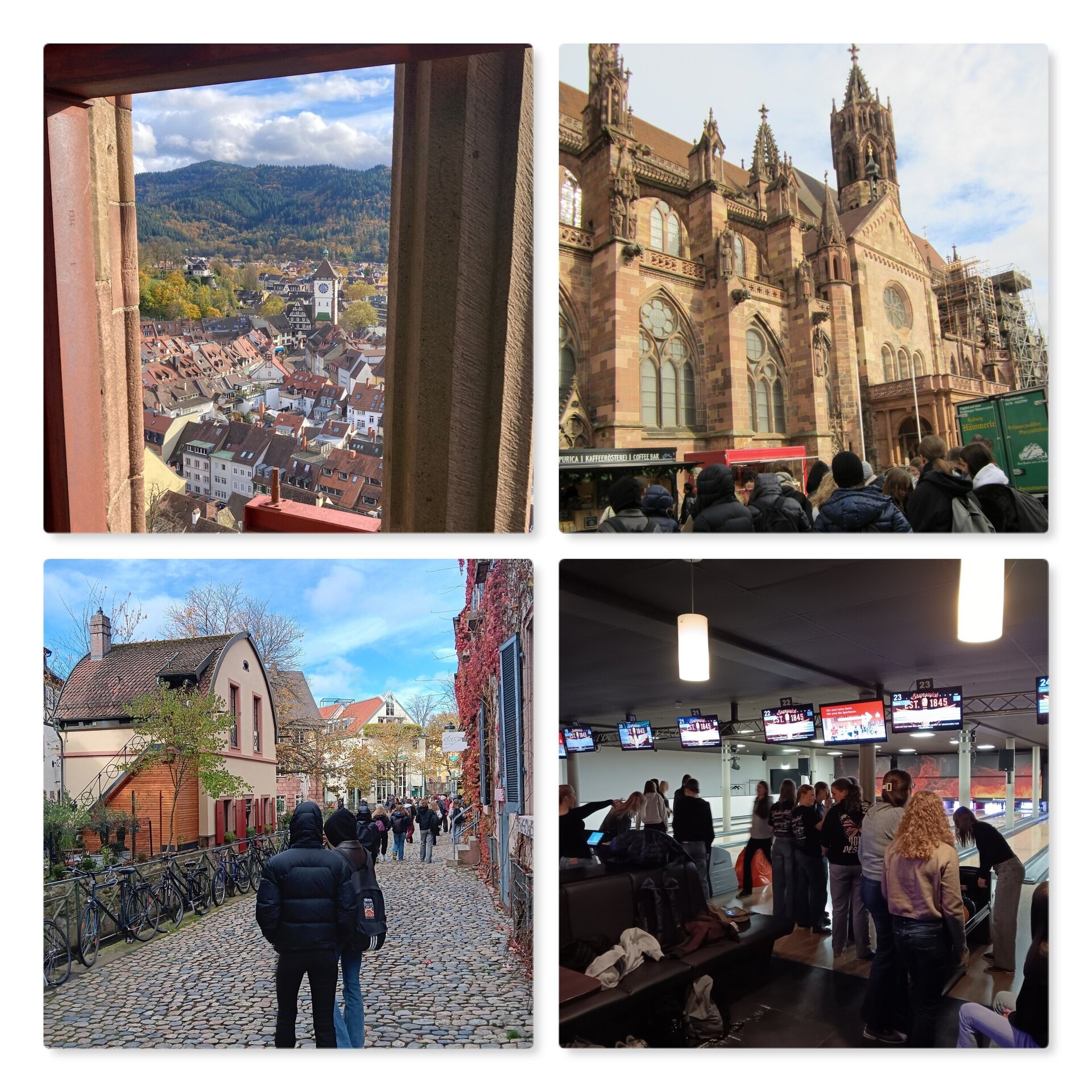 Der Dienstag begrüßte die Gruppe dann bereits weniger trist – perfektes Wetter für die geplante Stadtführung durch Freiburg, die sich als äußerst spannend erwies: Die Klassen erfuhren, dass Freiburg über mehrere Jahrhunderte zu Österreich gehörte, entdeckten die berühmten „Bächle“, die an diesem Tag wegen Reinigungsarbeiten leider meist kein Wasser führten, und schlenderte durch die einladenden Gassen der Altstadt rund um das Freiburger Münster. Anschließend blieb bei strahlendem Sonnenschein Zeit, den Markt zu besuchen und regionale Spezialitäten zu probieren. Am Nachmittag standen verschiedene Aktivitäten in Kleingruppen auf dem Programm: Während einige den Aufstieg auf den Münsterturm wagten und mit einer atemberaubenden Aussicht über die Stadt belohnt wurden, besuchten andere das Augustinermuseum und bestaunten die vielfältigen Exponate. Der Tag endete nach einem sportlichen Bowlingabend, bei dem sich so manches bislang unentdeckte Talent zeigte, mit einem leckeren Pizza-Buffet.