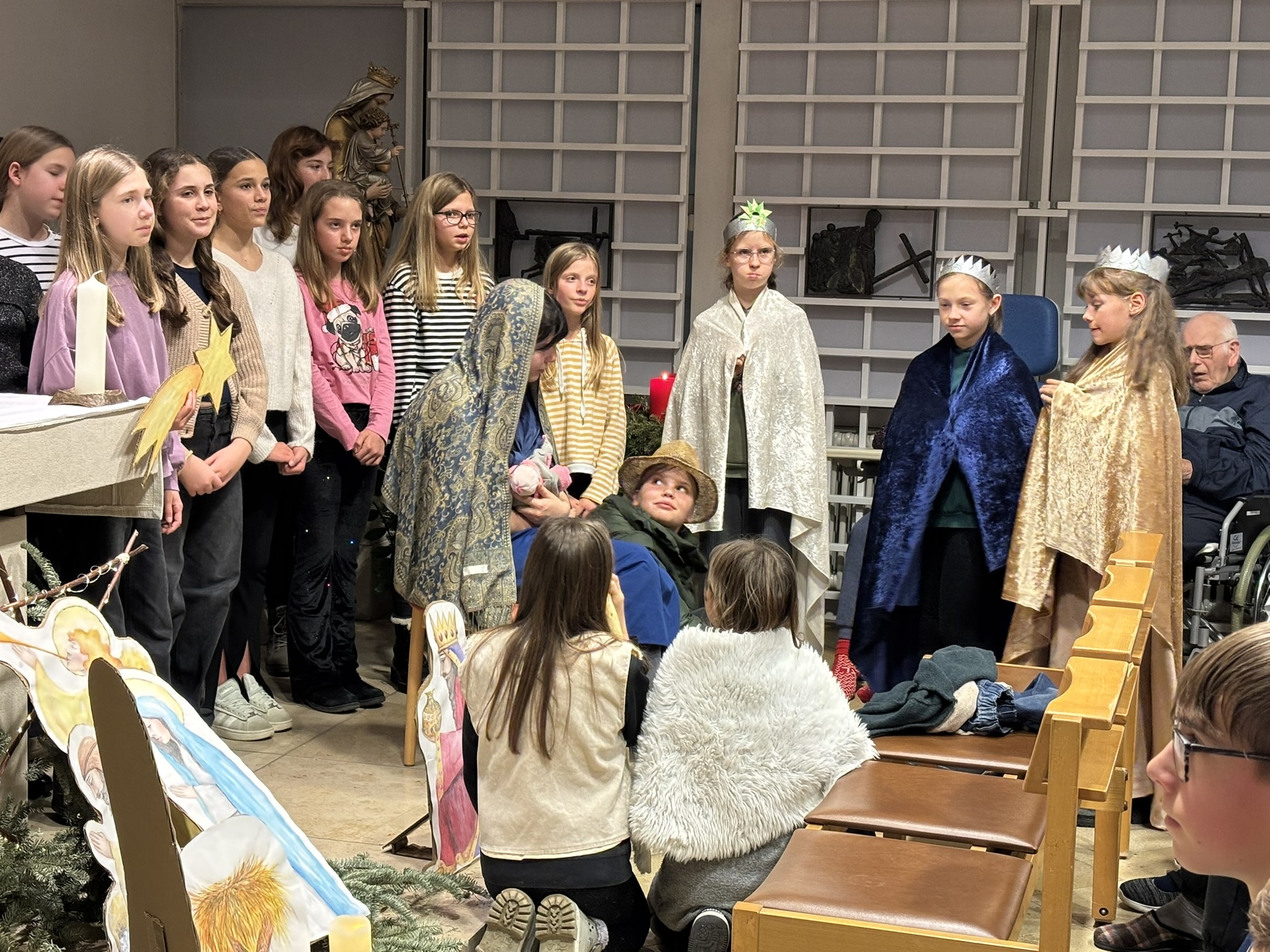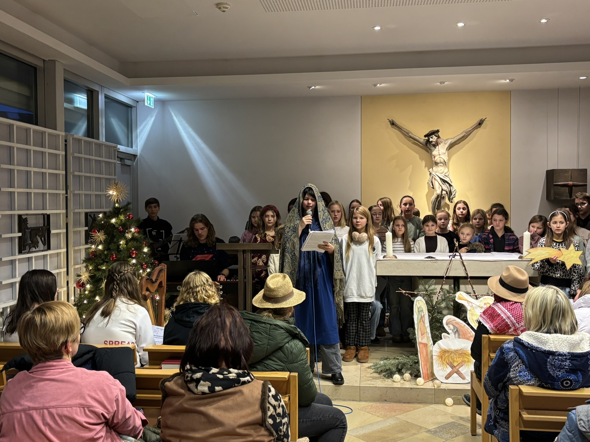 Die Kapelle des Eichstätter Klinikums platzte fast aus allen Nähten – so viele Schülerinnen und Schüler der Fünft- und Sechstklasschöre nahmen sich in der letzten Woche vor Weihnachten Zeit, um mit den Schulbandmitgliedern das Weihnachtskrippenspiel „Der fragende Engel“, das sie für den Adventsmarkt einstudiert hatten, vor den Patienten, deren Gästen und den Angehörigen des Klinikpersonals aufzuführen. Wie im Vorjahr folgte die Musikfachschaft gerne der Einladung der Klinikseelsorgerin Barbara Ulrich an alle Schulen, in der Vorweihnachtszeit mit Musik und Wort Hoffnung und Freude zu schenken. Die Adventsmeditation der Maria-Ward-Realschule endete mit dem Psalm 139 „Von allen Seiten“ der anwesenden Fünftklässler, dem zentralen Gedanken des diesjährigen Weihnachtsgottesdienstes der Schule. Die Sängerinnen und Sänger sowie die Musiker ernteten viel Lob für ihren Auftritt, sie hätten als Engel der Freude Licht und die Zuversicht zu den Patienten gebracht, nicht allein zu sein, so Frau Ulrich in ihrer Dankesrede.